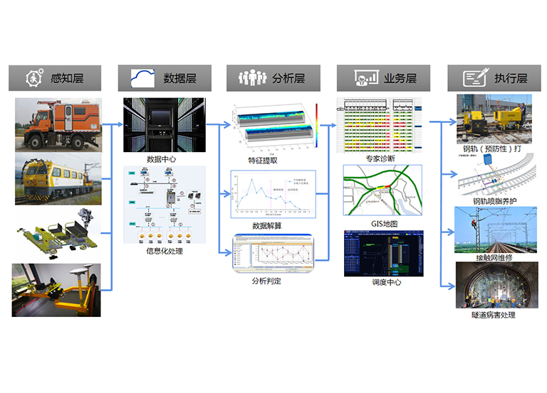 源自不同的智能檢測(cè)裝備的數(shù)據(jù)經(jīng)過數(shù)據(jù)中心整理、歸并、解算,生成過程性分析數(shù)據(jù)和直觀的判斷結(jié)果,最終對(duì)線路狀況提供運(yùn)營維保的建議和意見。