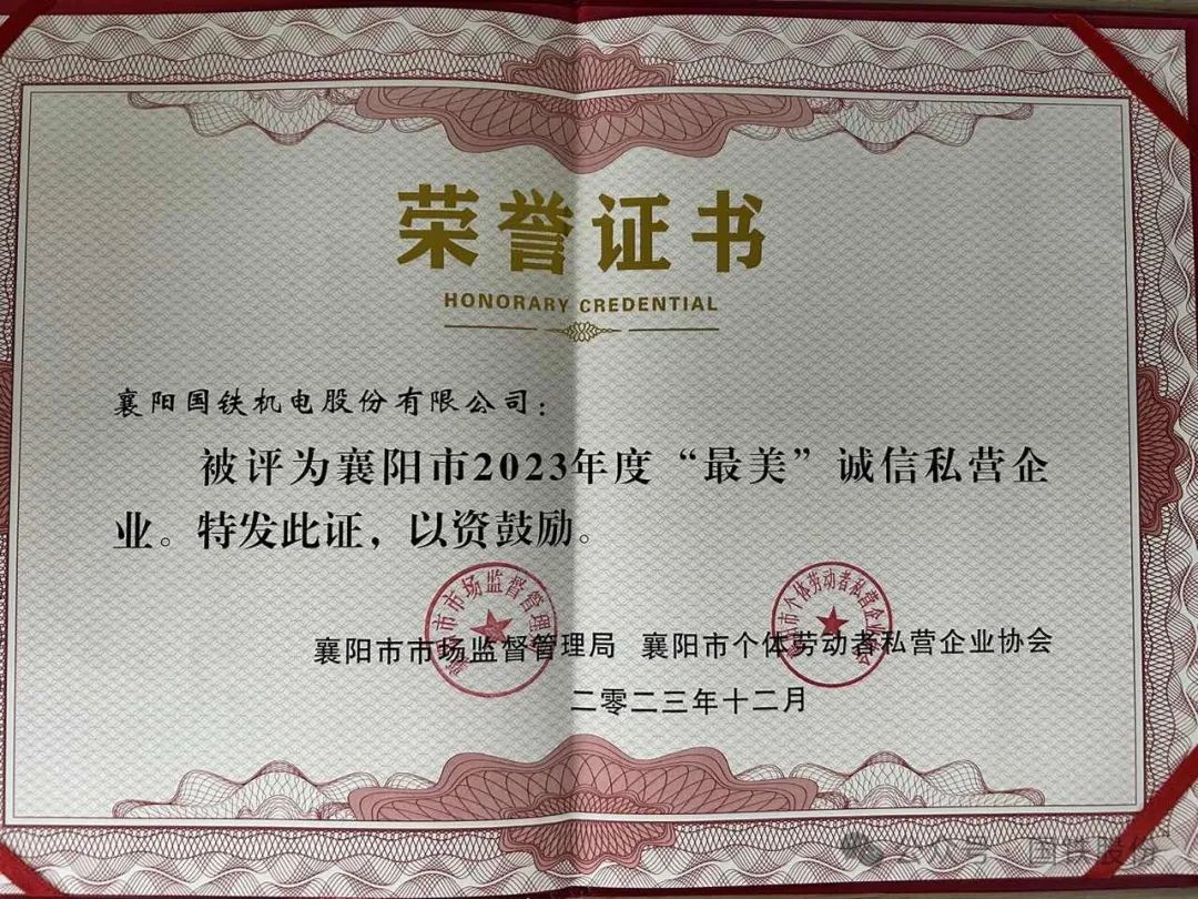 【喜報(bào)】國(guó)鐵機(jī)電獲“襄陽(yáng)市2023年度‘最美’誠(chéng)信私營(yíng)企業(yè)”榮譽(yù)