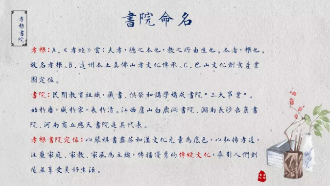 ? ?【孝根書院】以琴、棋、書、畫、茶和漢文化元素為底色,以弘揚孝道,注重家庭、家教、家風為主線,傳播優(yōu)秀的傳統(tǒng)文化,導引人們創(chuàng)造并享受美好生活。?